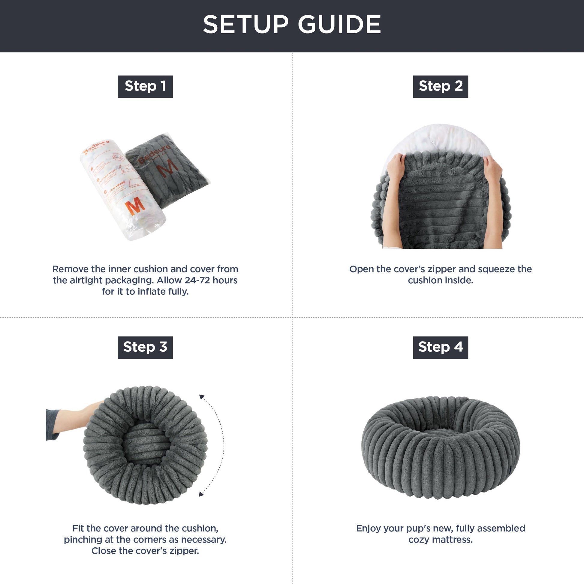 Secure & Calming Design The donut shape gently surrounds your pet, enhancing their sense of security and well-being while blending seamlessly into any home décor with its modern Dark Grey finish.